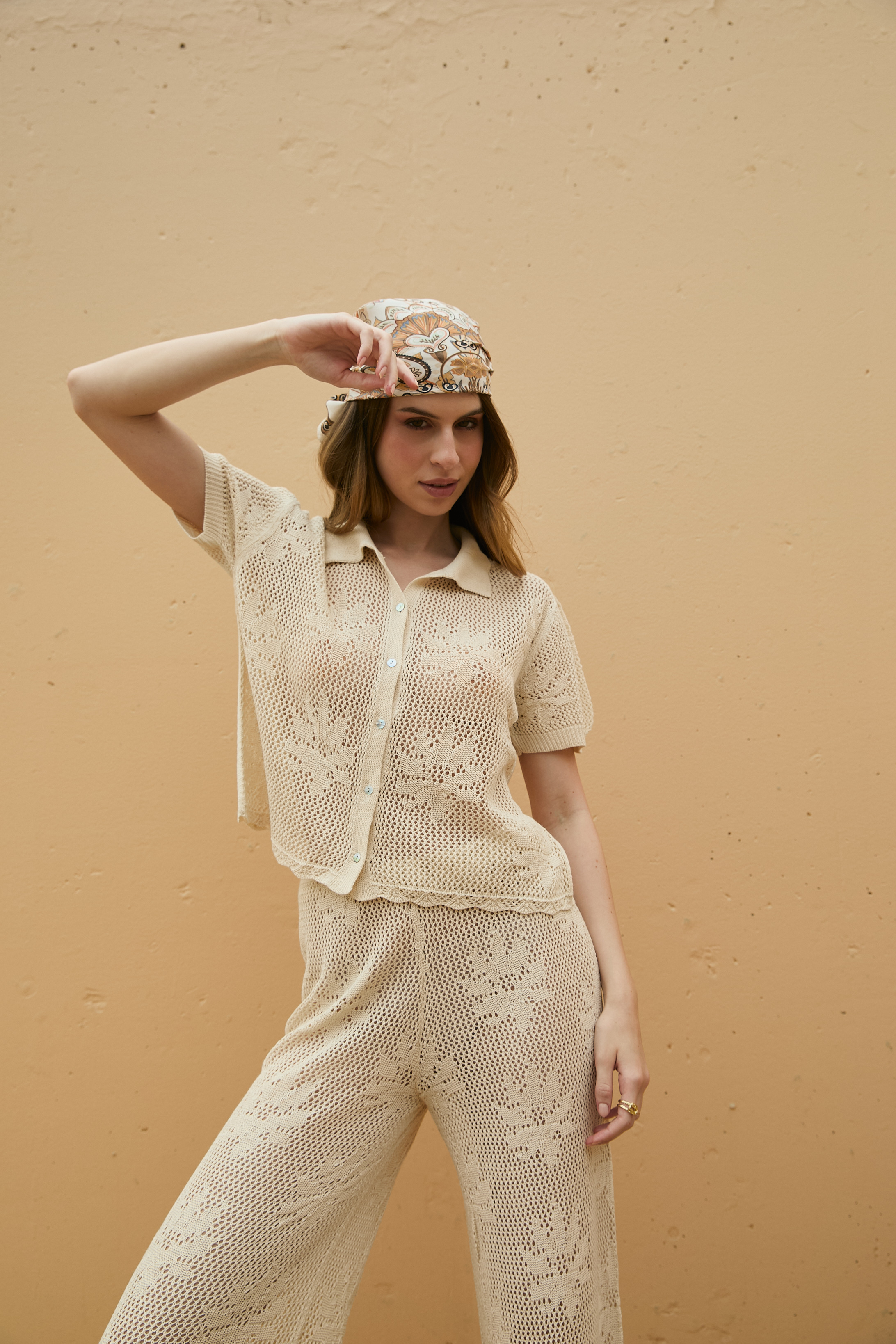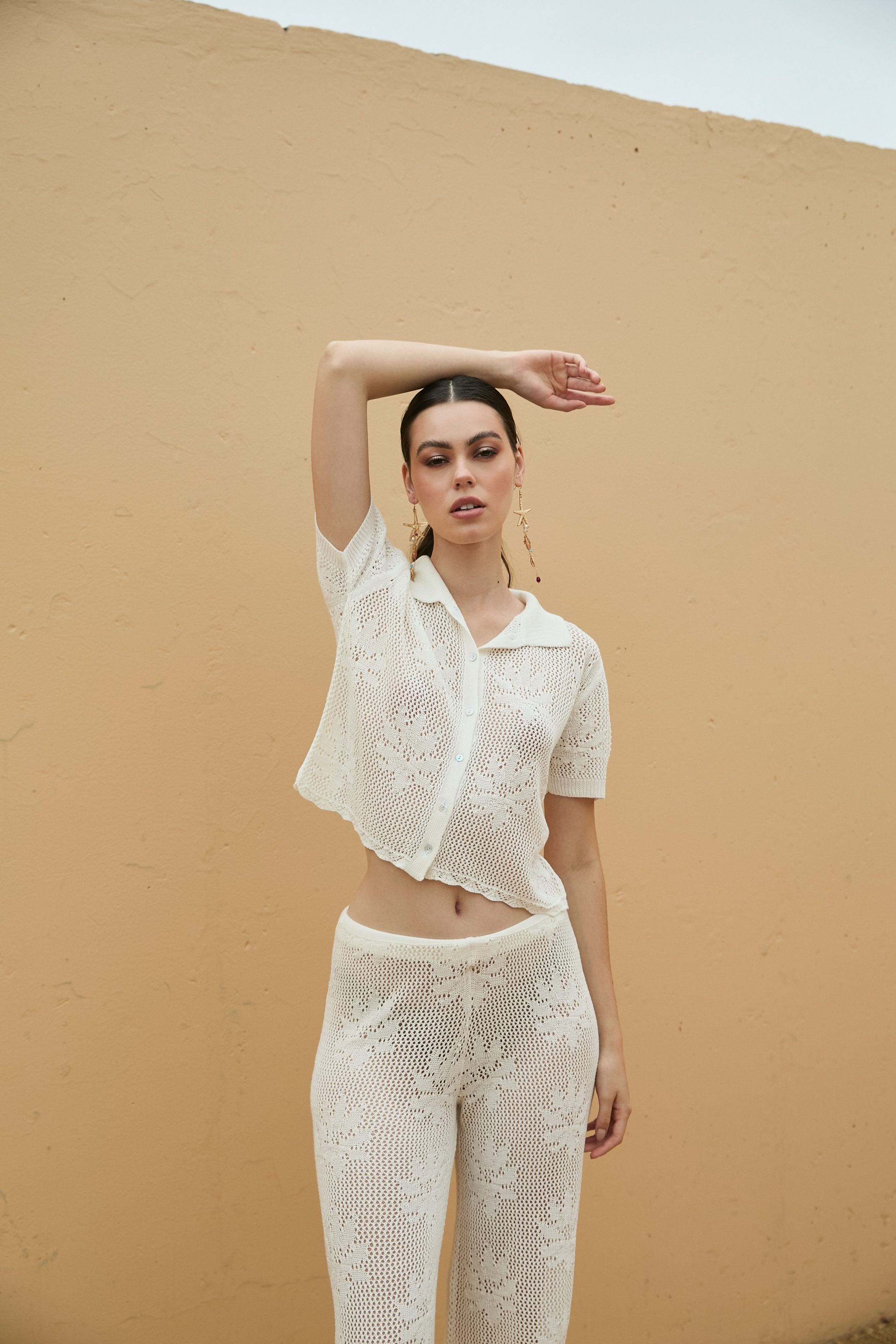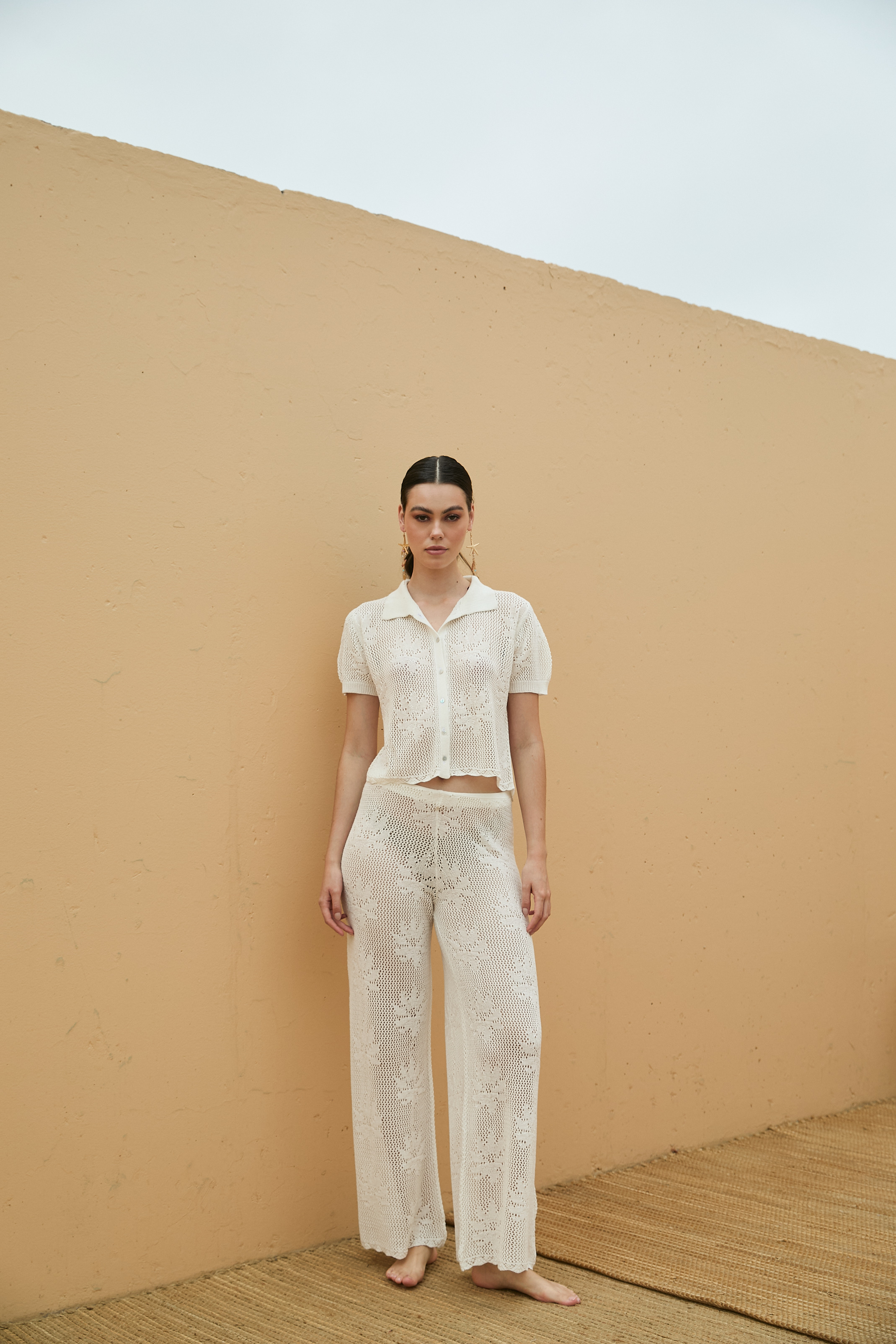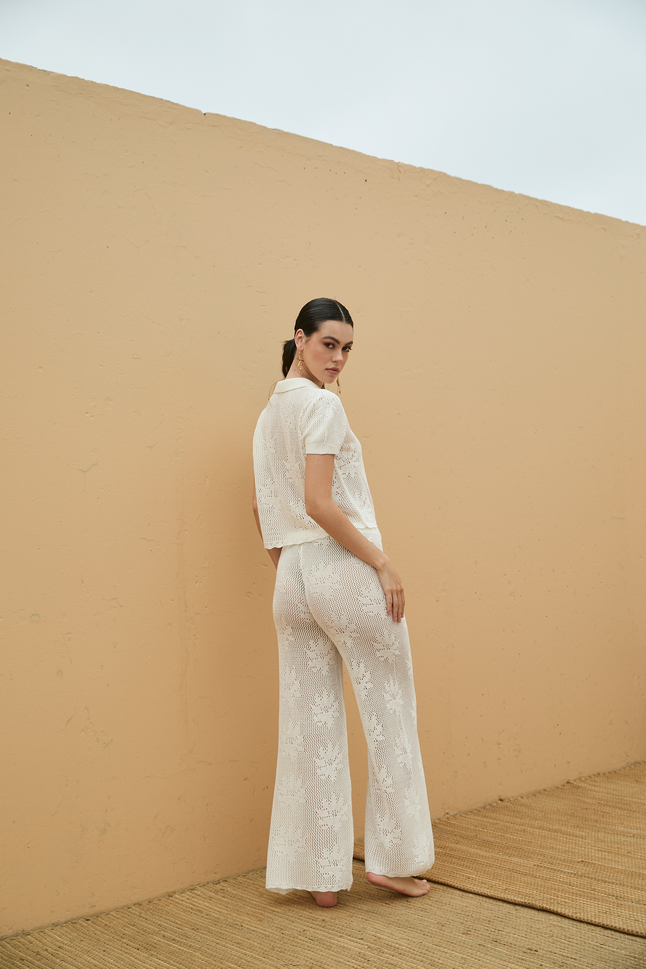 Pantalón fabricado en cotton mix con pretina elasticada en la cintura y detalle de calado con flores.
