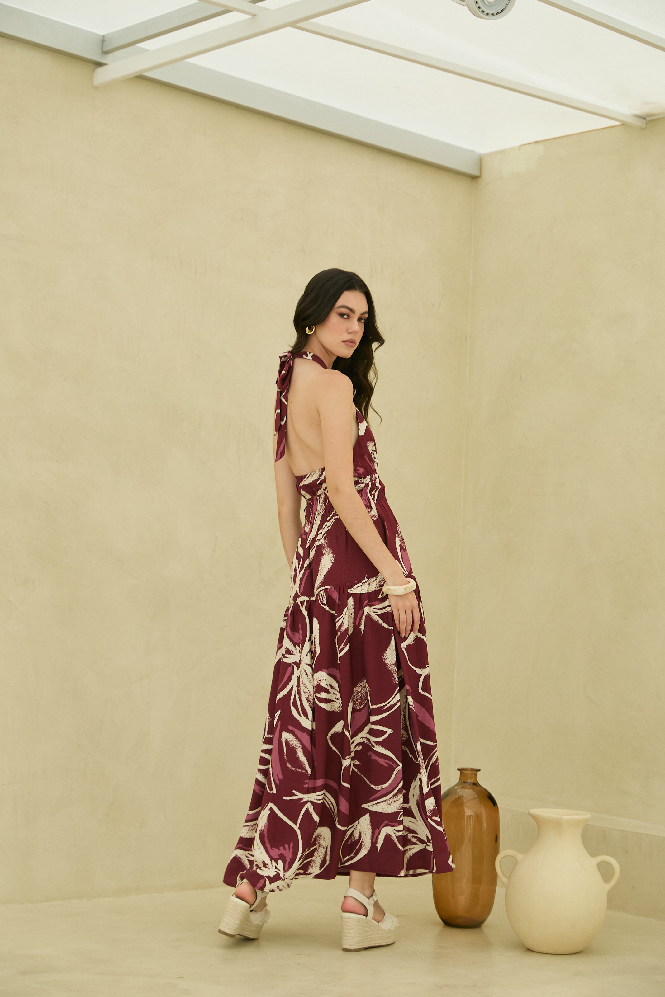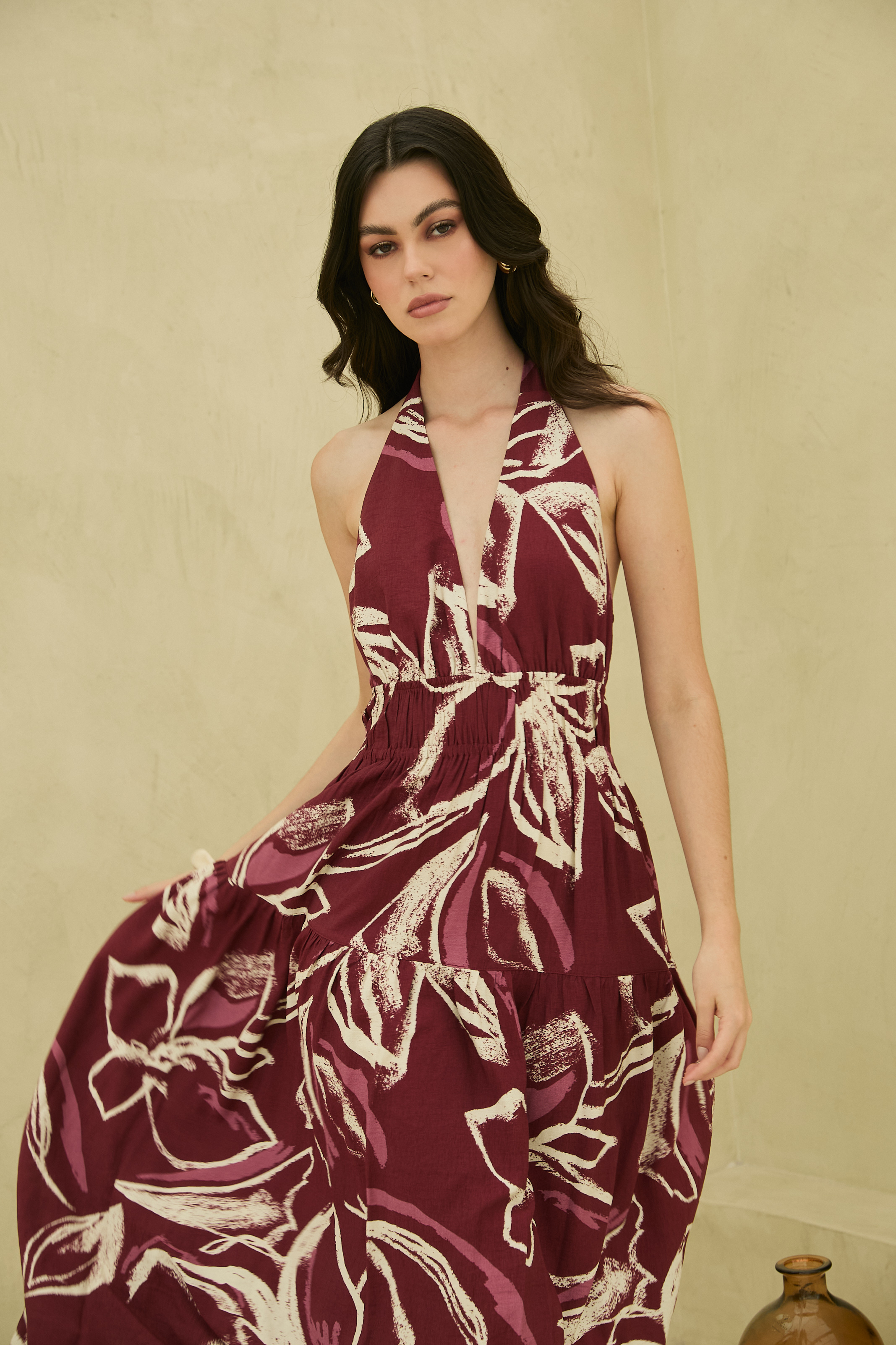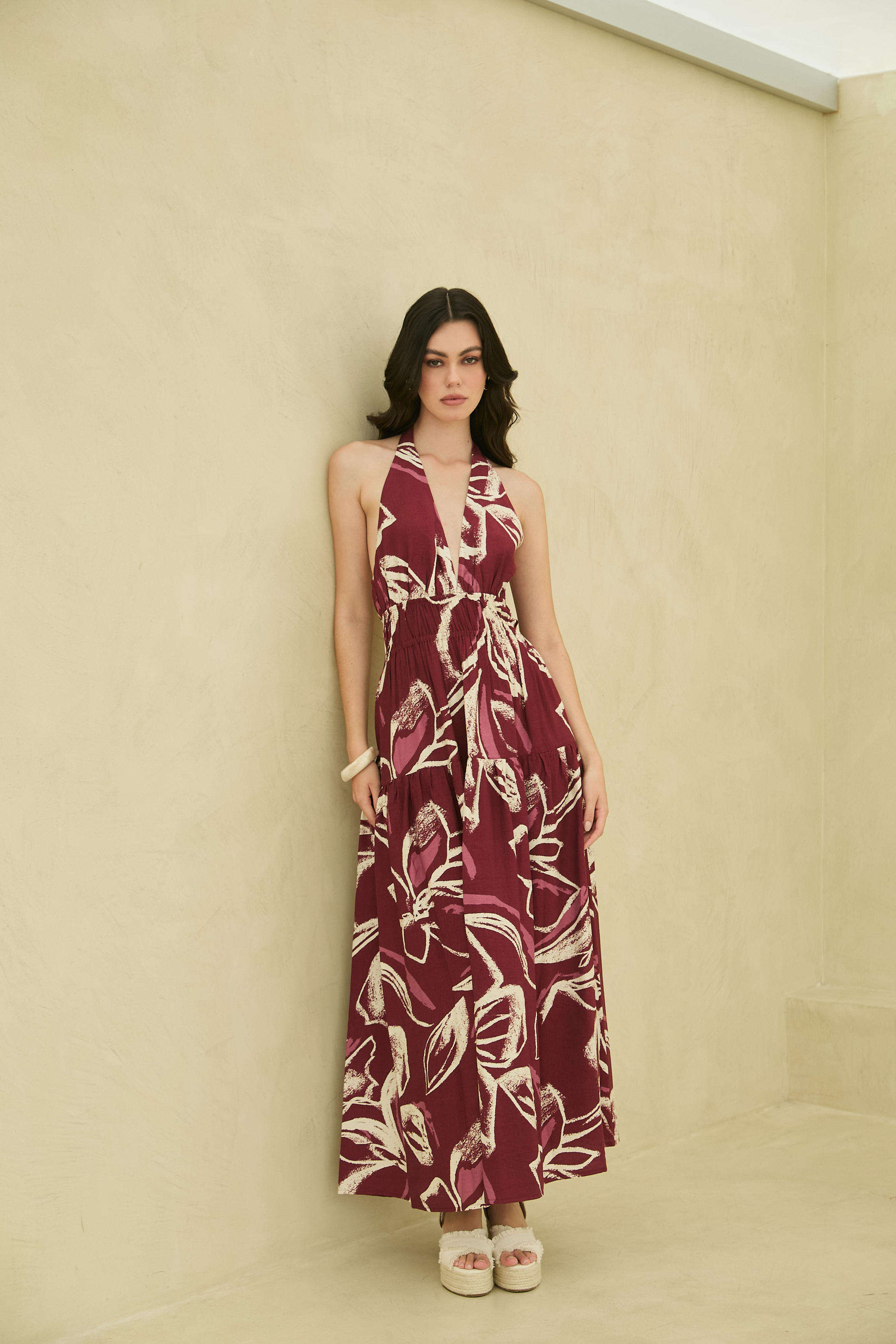 Maxi vestido de cuello halter para amarrar en el cuello, escote pronunciado en V.